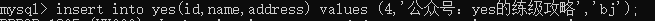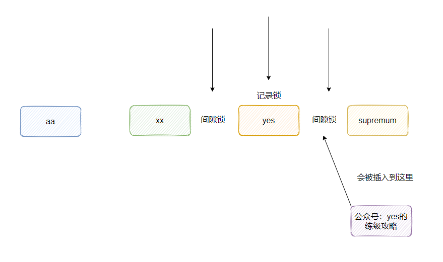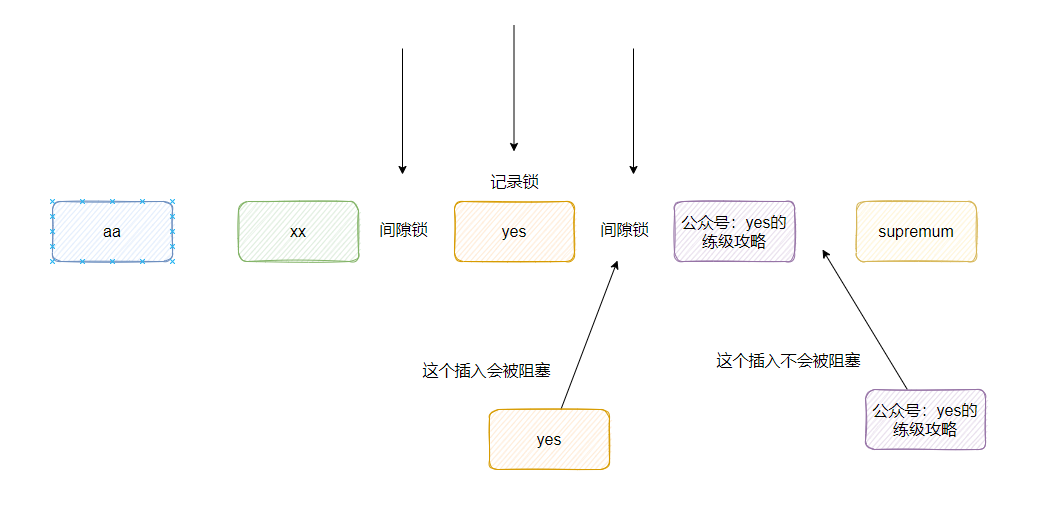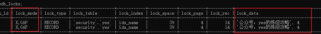 可以看到,此时被阻塞的锁是记录锁+间隙锁(next-key lock),这符合我们的认知和上面的图,因为要插入的数据在 yes 和公众号:yes的练级攻略之间。
