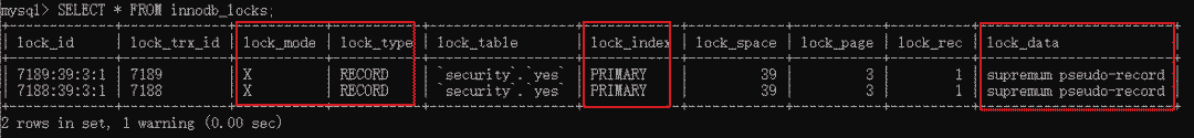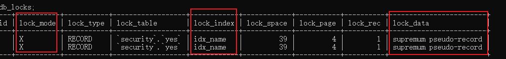 但是从截图结果来看此时lock_mode是记录锁,且 lock_data 是 supremum,这又涉及到我的盲区了,难道是最后的记录插入比较特殊?所以不是因为间隙锁被阻塞,而是被最大记录行锁阻塞?