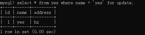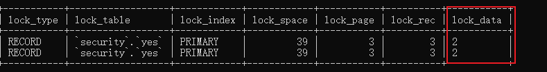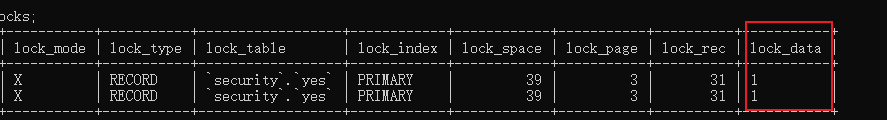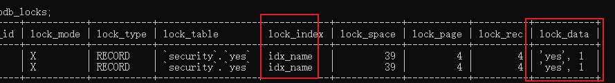 可以看到,锁的索引确实变成了 idx_name,lock_data 显示锁的是 yes 这个记录,id 为 1。