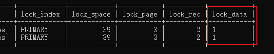 lock_data 变为 id 为 2 的记录了,也就是说事务 C 扫描了 id 为 1 的记录之后,发现不符合条件,就释放了,(不然 lock_data 的值应该为 1)然后继续扫描 id 为 2 的记录,符合条件,于是上锁。