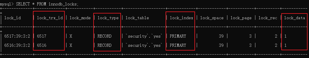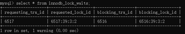 锁的类型就是行级锁,此时的锁为 X 锁,锁的索引就是主键索引,这个结果表明的意思是事务 B(6517)想要 id 为 1 的记录锁,但是这个记录此时被事务A(6516)占有。