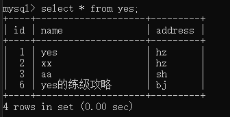 CREATE TABLE `yes` ( `id` bigint(20) NOT NULL AUTO_INCREMENT, `name` varchar(45) DEFAULT NULL, `address` varchar(45) DEFAULT NULL, PRIMARY KEY (`id`), KEY `idx_name` (`name`) ) ENGINE=InnoDB AUTO_INCREMENT=4 DEFAULT CHARSET=utf8mb4