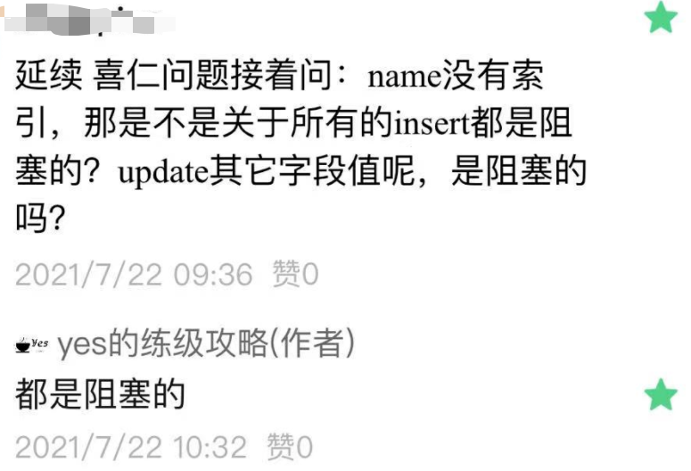 这是预期之内的阻塞,因为按照 name 为索引,yes这条记录是排在最后的(字母序),为了防止幻读,可重读隔离级别下会在对应记录前后加入间隙锁,而新的记录的插入恰巧需要排 yes 这条记录的后面。