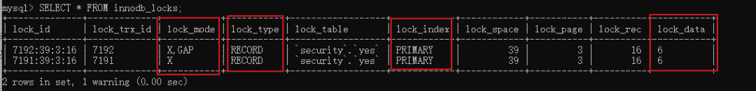 此时,调用 SELECT * FROM innodb_locks; 查看相关锁的信息
