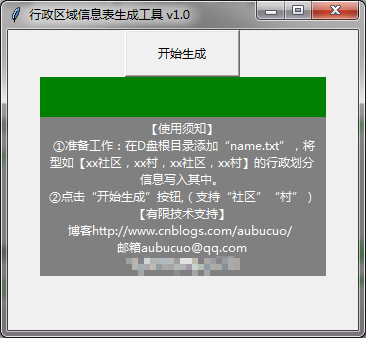 1 # -*- coding: utf-8 -*- 2 """ 3 Created on Thu Dec 28 11:18:39 2017 4 5 @author: Administrator 6 """ 7 8 import re 9 import xlwt 10 import tkinter as tk 11 from PIL import Image,ImageTk 12 13 def _getexl(): 14 try: 15 f = open('D://name.txt','r') 16 data = f.read() 17 except Exception as e: 18 var2.set('未找到D://name.txt!') 19 window.update() 20 #print (data) 21 workbook = xlwt.Workbook(encoding = 'ascii') #创建exl工作本 22 worksheet = workbook.add_sheet('My Worksheet') 23 m = 1 24 n = 1 25 for a in set(re.findall('(.+?社区).+?', str(data))): 26 worksheet.write(m, 0, a) 27 m += 1 28 for b in set(re.findall('(.+?村).+?', str(data))): 29 worksheet.write(n, 1, b) 30 n += 1 31 workbook.save('D://行政划分.xls') 32 var2.set('已经生成 D://行政划分.xls' ) 33 window.update() 34 #print ('写入完成!') 35 36 window = tk.Tk() #图形化窗口 37 window.title('行政区域信息表生成工具 v1.0') 38 window.geometry('350x300') 39 40 B1 = tk.Button(window,text = '开始生成',\ 41 command=_getexl,width=15,height=2) 42 B1.pack() 43 44 var2 = tk.StringVar() #tk字符串变量? 45 l2 = tk.Label(window,textvariable=var2,bg='green',\ 46 fg='white',width=40,height=2) 47 l2.pack() 48 49 l1 = tk.Label(window,text = '【使用须知】\n ①准备工作:在D盘根目录添加“name.txt”,\ 50 将型如【xx社区,xx村,xx社区,xx村】的行政划分信息写入其中。\ 51 ②点击“开始生成”按钮,(支持“社区”“村”)',bg='gray',width=40,fg='white',wraplength=270) 52 l1.pack() 53 54 load = Image.open('hndx-min.png') 55 png = ImageTk.PhotoImage(load) 56 l3 = tk.Label(window,image = png) 57 l3.image = png 58 l3.pack() 59 60 window.mainloop()