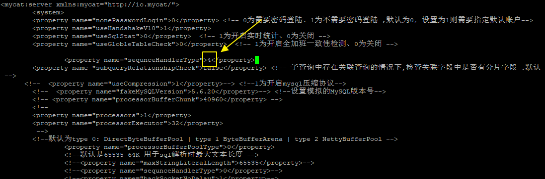 - 首先修改主键自增方式为 4 ,4 表示使用 zookeeper 实现主键自增。