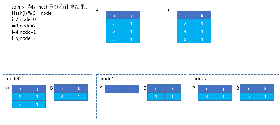 将两表按 join 的列,按 hash 特征重新分布到每个节点上。执行分布式的 join 时,如果各个执行节点的数据没有按照 join 列的特征进行分布,这个时候就会将数据进行 hash 重分布,具体操作如下: