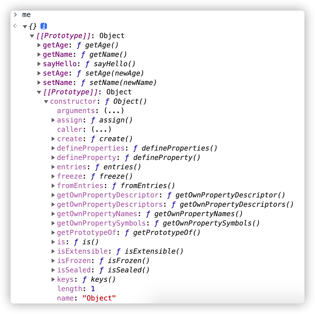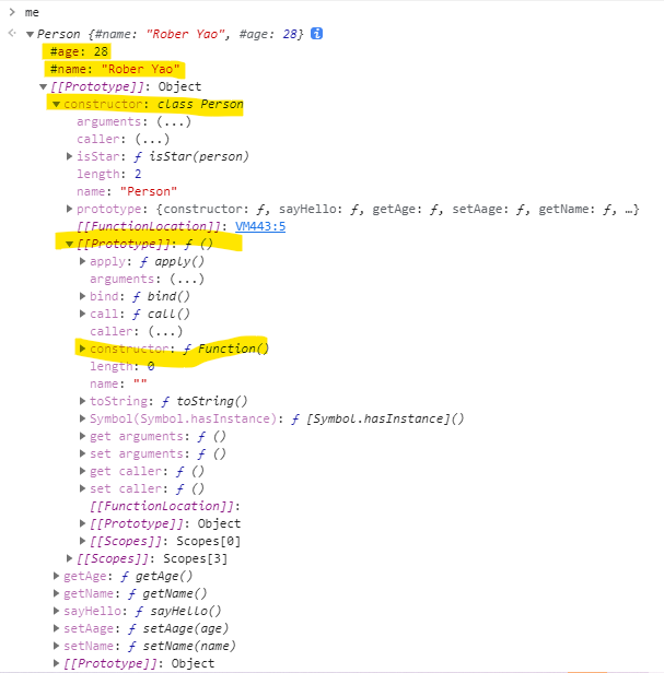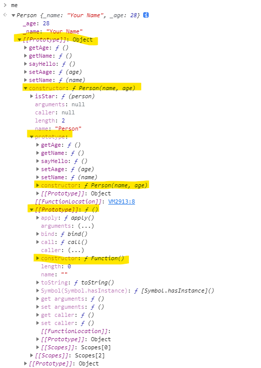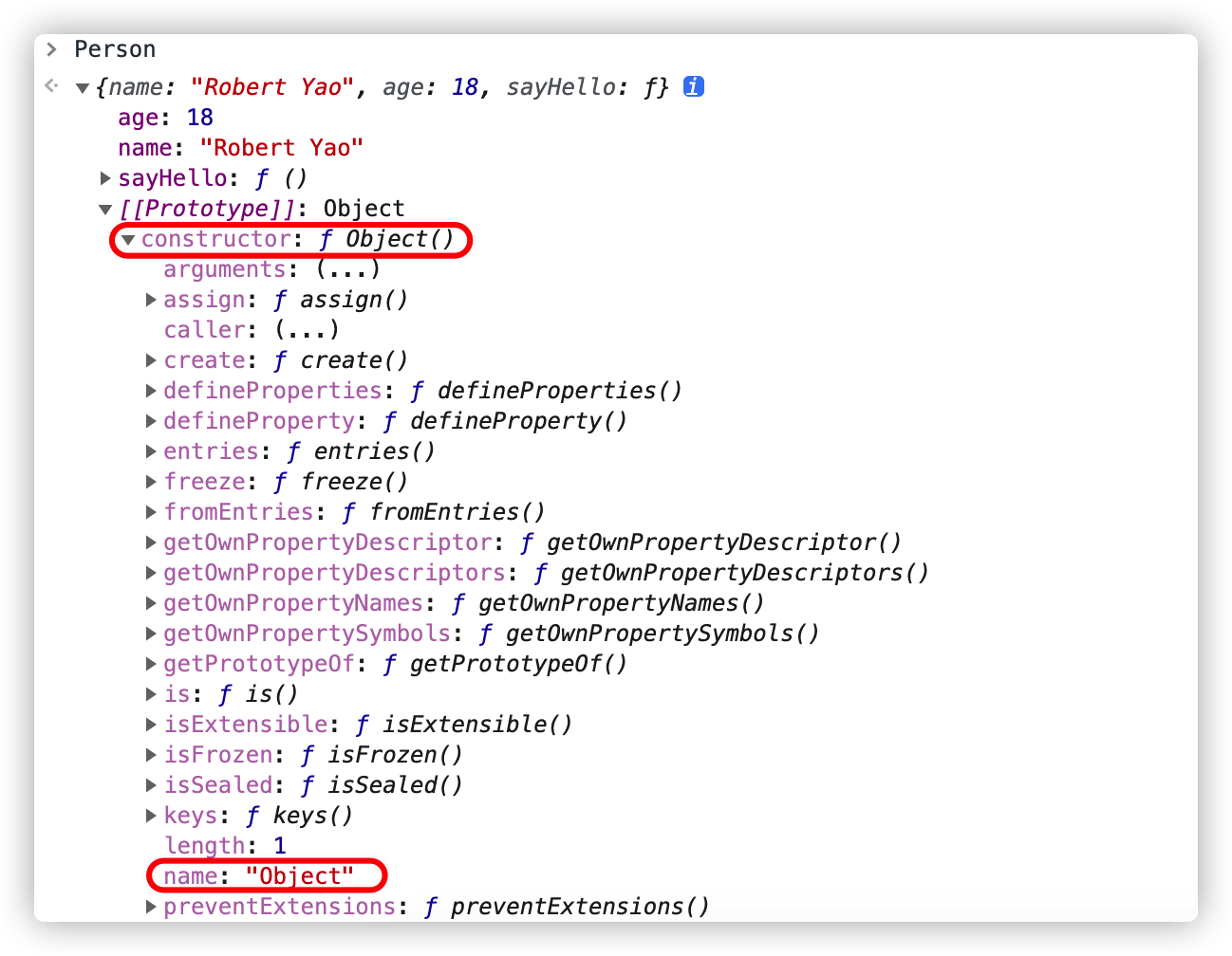 通过上图,可以清晰的看到 Person.__proto__(也就是图中的 [[Prototype]]),它的 constructor 对象的 name 属性是 Object。这说明 Person 对象是 Object() 的一个实例,也就是说对象字面量是 Object() 对象的实例。通过这个例子大家应该初步感受到原型链的能力了吧!