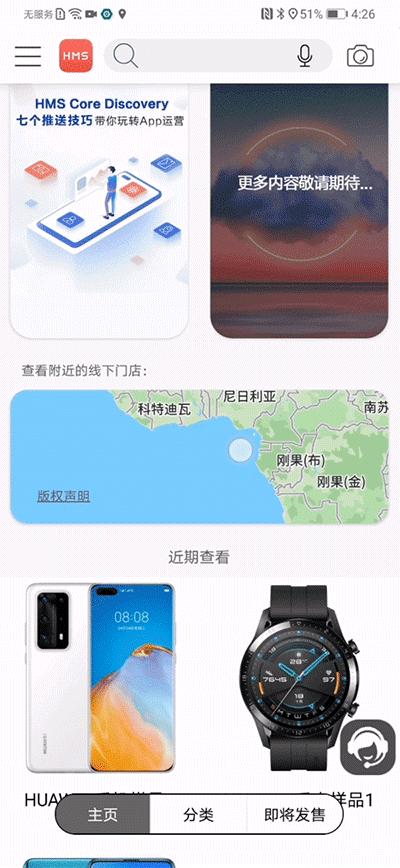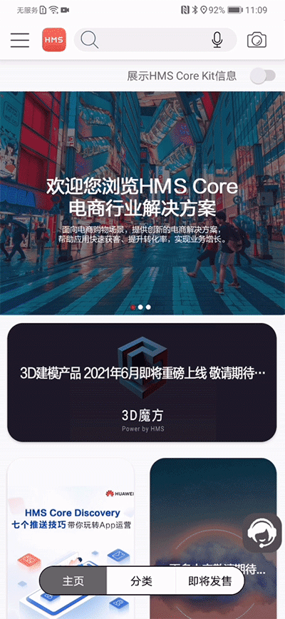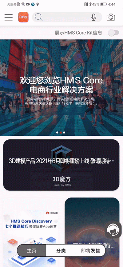 首页点击客服助手图标,即可体验Search Kit智慧助手服务,为电商开发者提供智能客服前端、云端API、云端存储与处理等服务,节省人力成本的同时给用户更加智能的客服体验,热点问题、交互问答、语音助手等功能一应俱全。