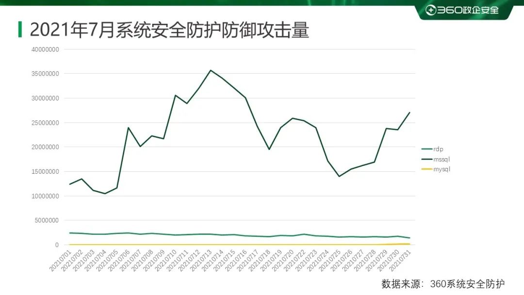 通过观察2021年7月弱口令攻击态势发现,RDP和MYSQL弱口令攻击在总体量级层面无较大变化。而利用MSSQL进行传播勒索的家族本月的感染量也有大幅度的下降——例如上个月的GlobeImposter家族。