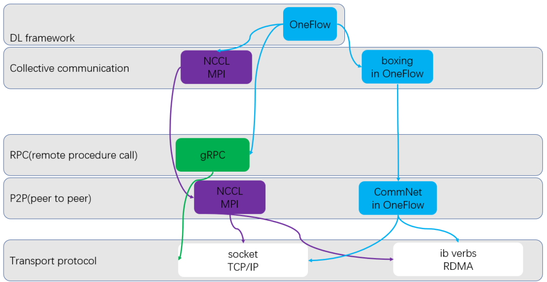 首先引入一层点对点(peer to peer, P2P)传输的抽象,譬如ZeroMQ隐藏了socket编程的复杂性,只向上暴露基于消息和管道的抽象。P2P抽象可以隐藏掉socket和IB verbs的差别,向上层暴露一致的编程接口,譬如NCCL,PyTorch TensorPipe和OneFlow CommNet模块都为这个目的而生。