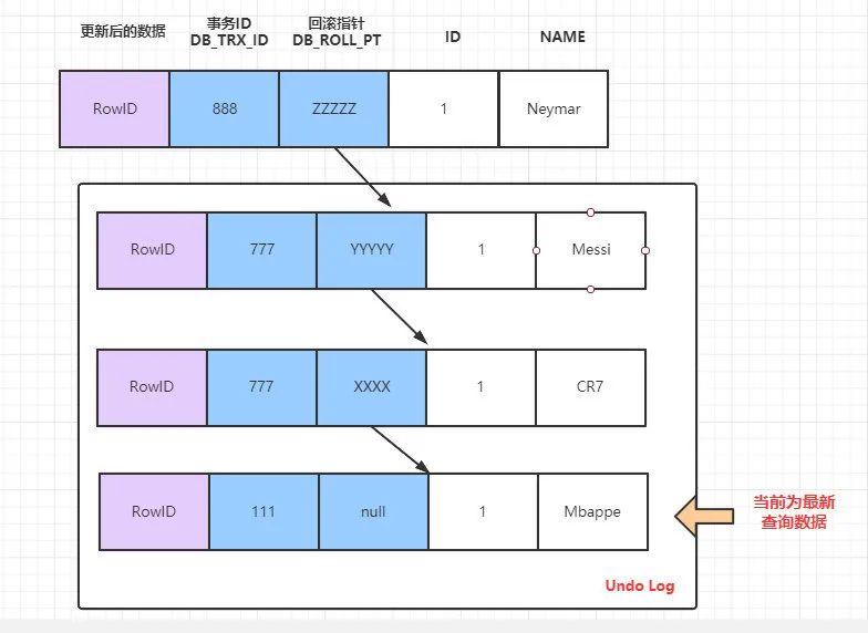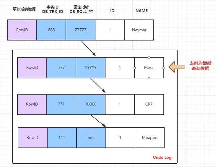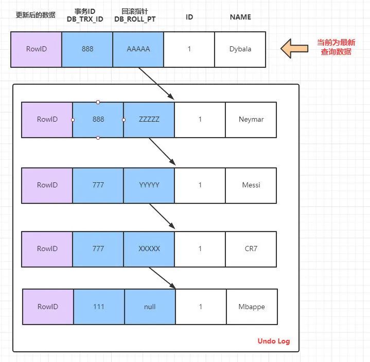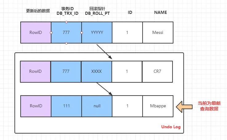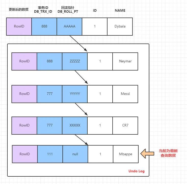 再当前执行select语句时生成一个ReadView,此时 m_ids 内容是:[777,888],所以但前根据ReadView可见版本查询到的数据为 Mbappe。