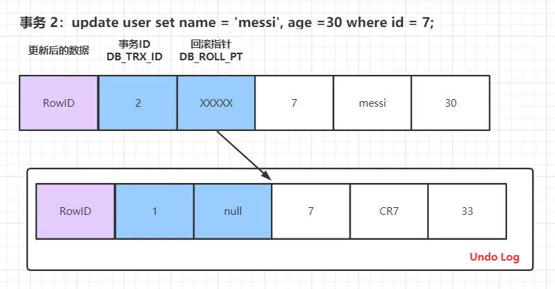 InnoDB的MVCC是通过在每行记录后面保存两个隐藏的列来实现的。一个保存了行的事务ID(DB_TRX_ID),一个保存了行的回滚指针(DB_ROLL_PT)。每开始一个新的事务,都会自动递增产 生一个新的事务id。事务开始时刻的会把事务id放到当前事务影响的行事务id中,当查询时需要用当前事务id和每行记录的事务id进行比较。