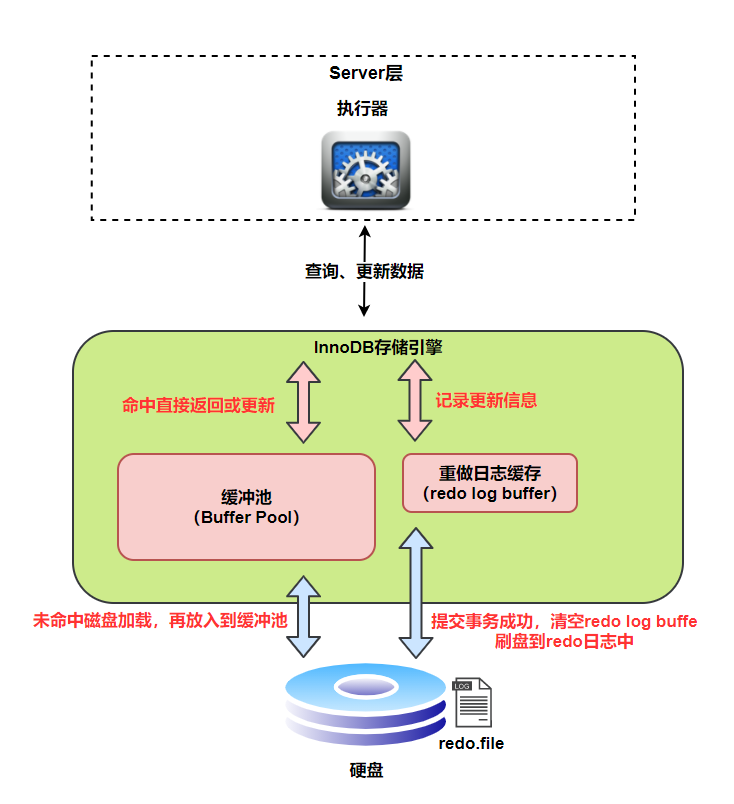 每当我们对表数据进行更新时,会把“在某个数据页上做了什么修改”记录到重做日志缓存(redo log buffer)里。