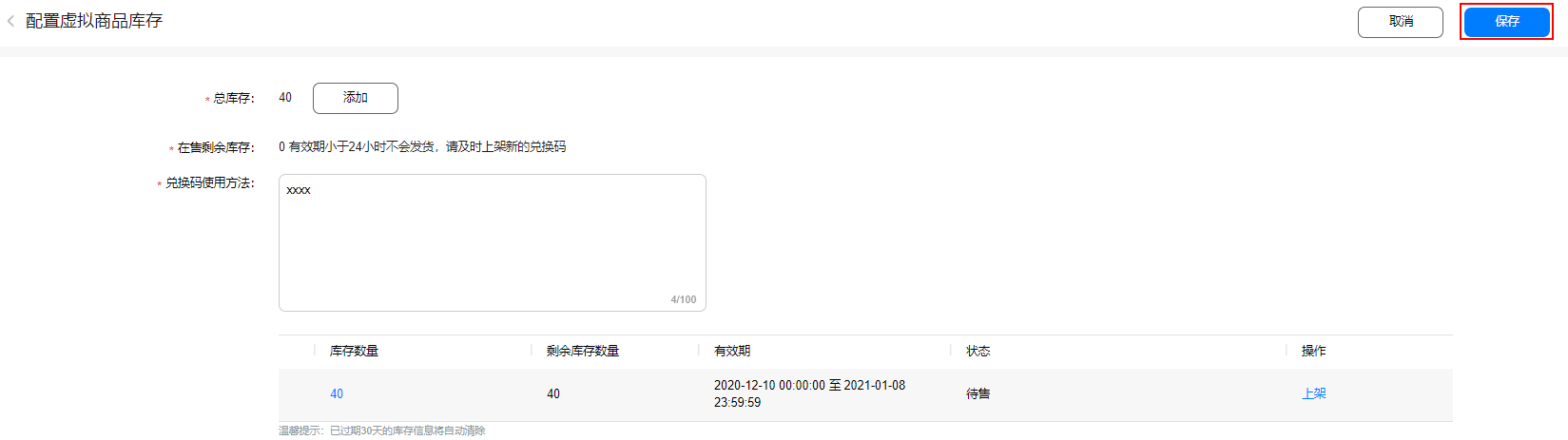 (5)进入“配置虚拟商品库存”页面,填写“兑换码使用方法”,点击右上方“保存”。