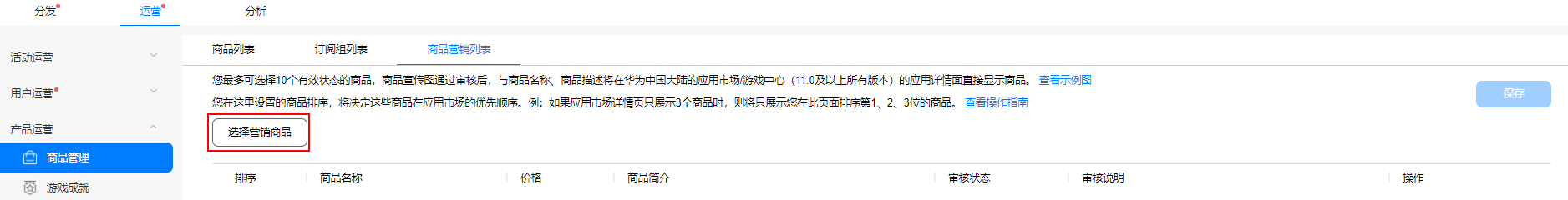 (2)选择“运营”页签,在左侧导航栏选择“产品运营 > 商品管理”,选择“商品营销列表”页签,点击“选择营销商品”。
