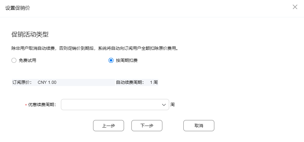按周期扣费:需设置优惠续费周期以及促销优惠价,低于原价的续费周期价格,吸引用户持续应用内商品及服务。