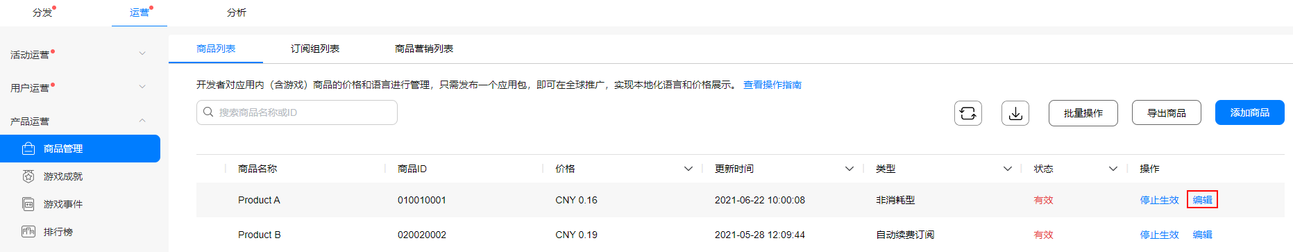 (1) 在你的应用商品列表中,点击需配置虚拟商品的非订阅类商品对应“操作”列的“编辑”。