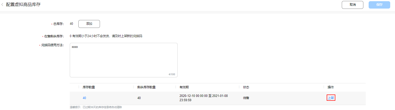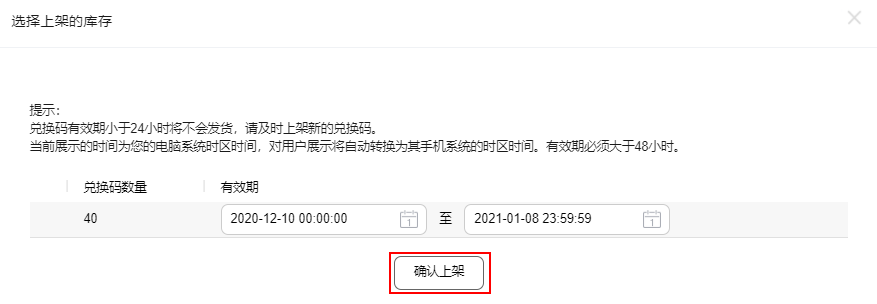(7)确认"兑换码数量”和“有效期”(可编辑),点击“确认上架”,并在弹出的提示窗口中点击“确定”,完成需上架库存的提交。