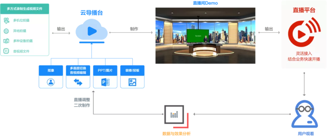 云导播正是依托了阿里云强大的视频直播和媒体处理服务,进行导播效果创新,对传统视频生产工具进行云端再造,一体化制作打造沉浸式直播体验。