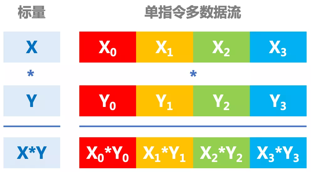 如上图所示,使用标量运算一次只能执行一对数据的乘法操作,而采用SIMD乘法指令则可以一次同时执行四对数据的乘法操作。作为向量体系结构的一种,SIMD使用一条向量指令开启一组数据操作,其中数据的加载、存储以及数据计算以流水线的形式进行。