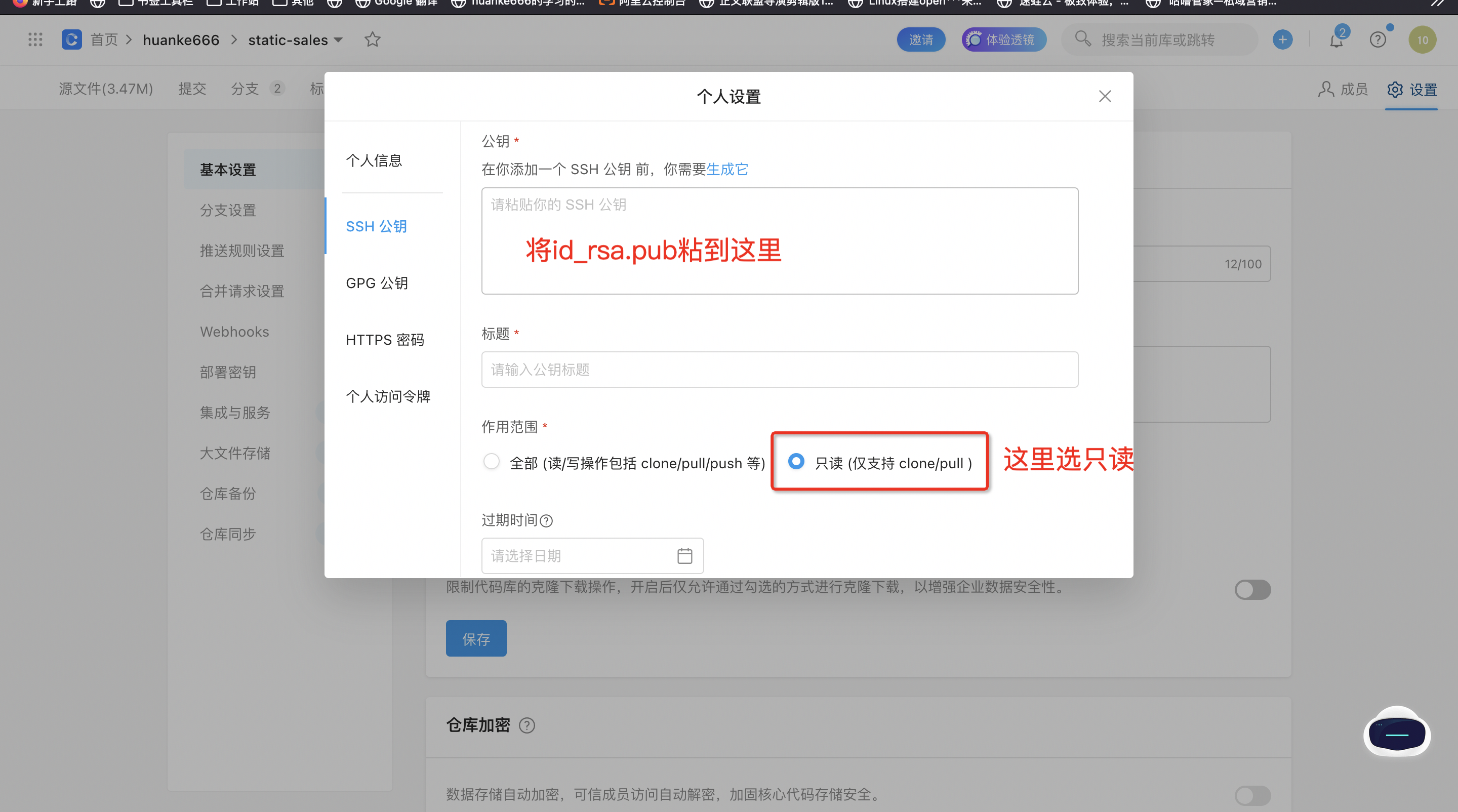 - 然后阿里云登陆ci账户,上传服务器的id_rsa.pub 到codeup仓库的ci个人设置下的ssh公钥,并设置为只读权限。