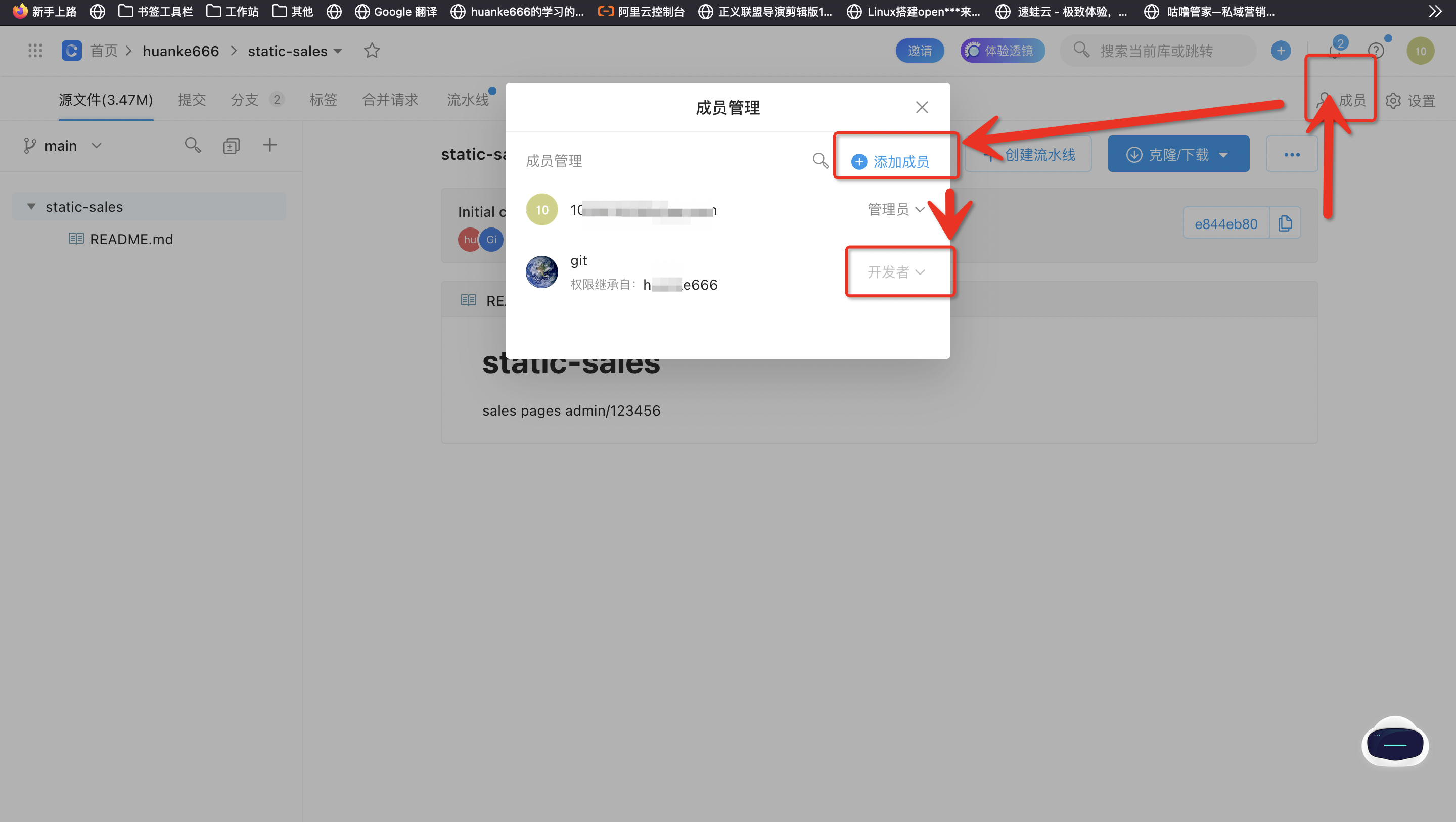 - 使用阿里云的codeup的话,先创建个拉取的ram账户(例如:ci),在codeup中将ram账户ci给授权为开发权限。