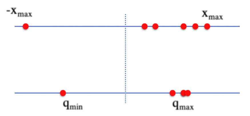 仿射方式:将模型中浮点数的最大最小值映射到整数的最大最小值。