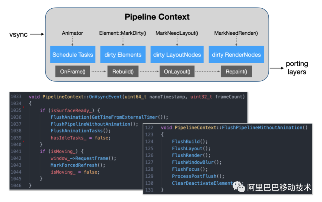 实现渲染管线的核心类是 PipelineContext,内部存储了多份脏节点的队列,当节点属性发生变化时,不会立即触发布局和绘制,而是加入到缓存的队列里。同时监听系统 vsync 信号,每帧按序 flush 内部记录的脏节点,依次执行动画检测、节点重新构建、重新布局、重新绘制、刷新光标等流程。