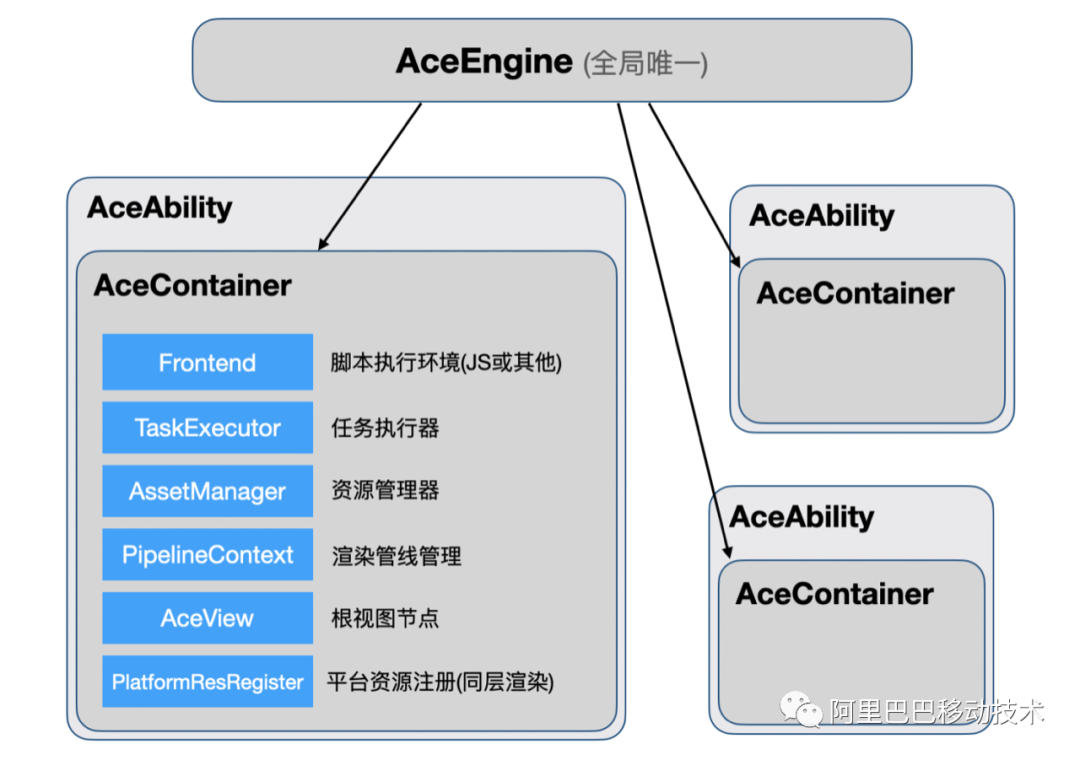 鸿蒙 UI 的基本单位是 FA (Feature Ability),对应一个 AceAbility 的实例,提供了生命周期的钩子,在执行 OnStart() 的时候会在内部创建一个 AceContainer。但是这个 AceContainer 不由 AceAbility 直接持有,而是由全局唯一的单例 AceEngine 管理。