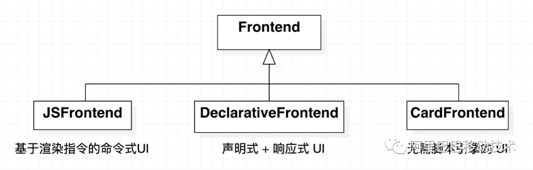 在 Frontend 部分,有三种不同类型的实现,分别是基于渲染指令的命令式 UI、声明式 UI、以及无需脚本引擎,用 JSON 文件渲染的 UI。命令式 UI 和 声明式 UI 都是用 QuickJS 作为脚本引擎,声明式 UI 里包含了 V8 的抽象,但是这部分好像没有开源出来。