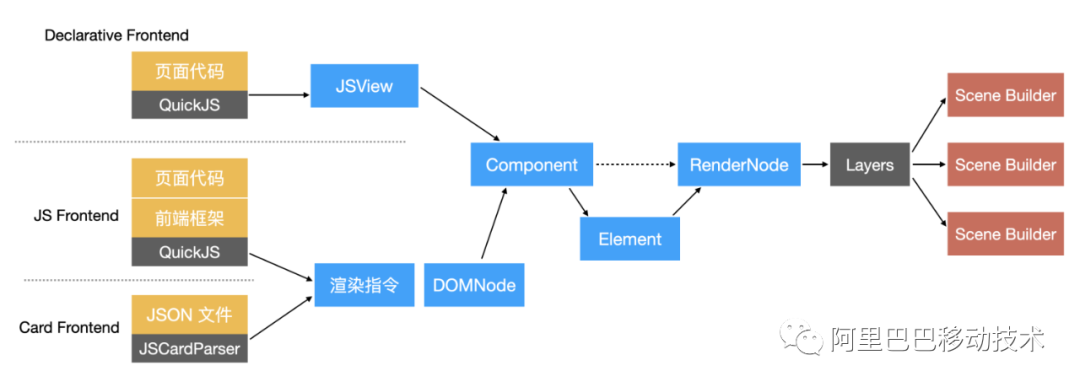 JSFrontend 和 CardFrontent 都是合成了渲染指令(C++),一个由前端框架 diff 生成,一个直接从 JSON 解析,然后构建内部一棵精简的 DOM 树(C++),注意这棵所谓 DOM 树是没有绑定到 JS 环境里的,没法通过 JS API 直接操作。每个 DOM 节点都会再生成一个 Component 节点。