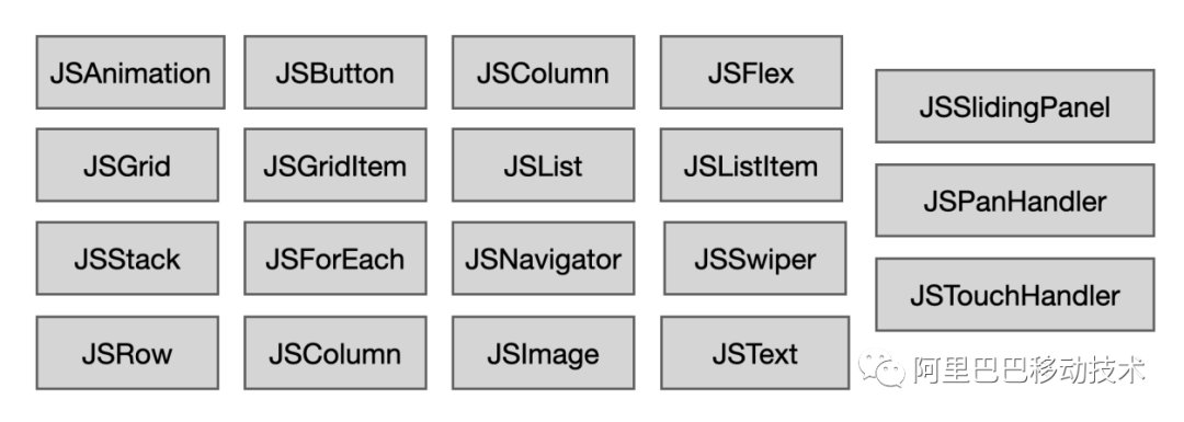 看起来和主流 JS + 原生渲染框架的架构都相似,提供了编译工具将源码编译成 js bundle,运行时有个在 JS 引擎启动后默认执行的 framework.min.js 文件,实现节点构建逻辑,然后在 C++ 层实现了一套 UIKit,支持的组件大概有二三十个。