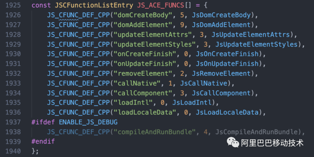 在初始化 JS 执行环境时,会先绑定一系列的原生接口,然后执行内置的 js framework,然后动态加载执行用户的 js 代码。在 js frontend 的 qjs_engine.cpp [8] 文件中,可以看到向 JS 环境中注册的接口: