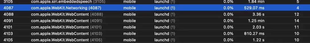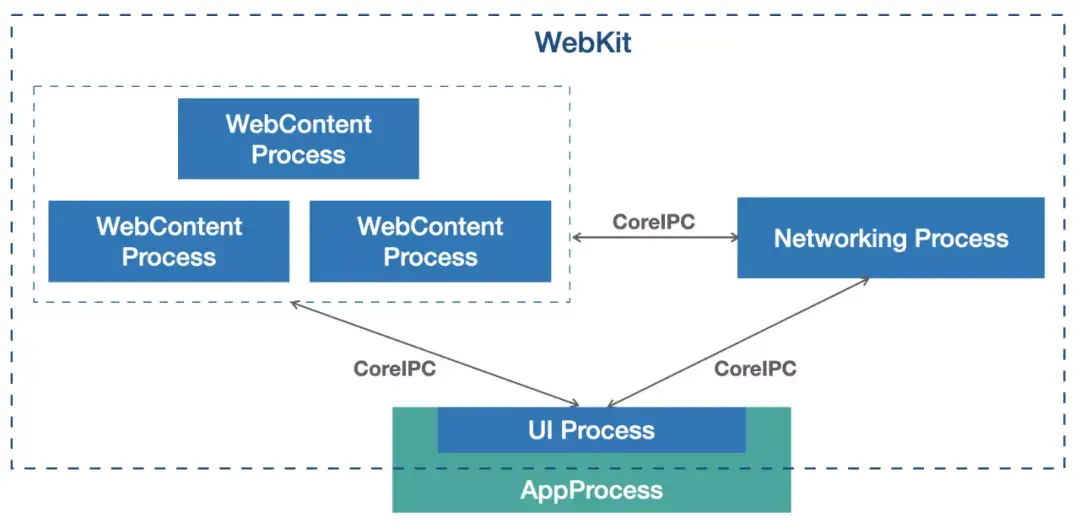 - UI Process:即 App 进程,WKWebView(WebKit) 中部分模块运行在此进程,会负责启动其它进程;