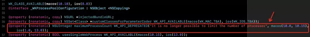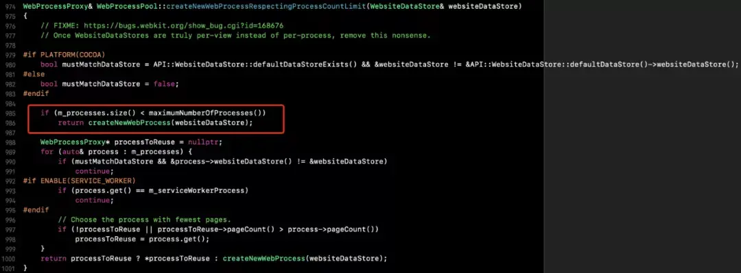 规则是优先使用创建新进程,当进程上线超过某阈值之后则会共享,在 WebKit 内部由 maximumProcessCount 控制。但是此规则只对 iOS13 之前的系统生效,iOS13 之后的系统,WKWebView 每次创建实例都会启动一个新的 WebContent Porcess。相关实现如下。