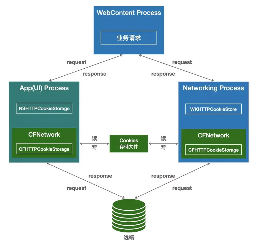 - 场景 1 - 未代理 WKWebView 网络请求:Cookie 完全由 Networking 进程管理,WKWebView 内可自闭环。大部分情况下 App 进程也无需感知,如果确实需要感知,可以根据业务场景选择 JS 桥接、强制持久化等方案;