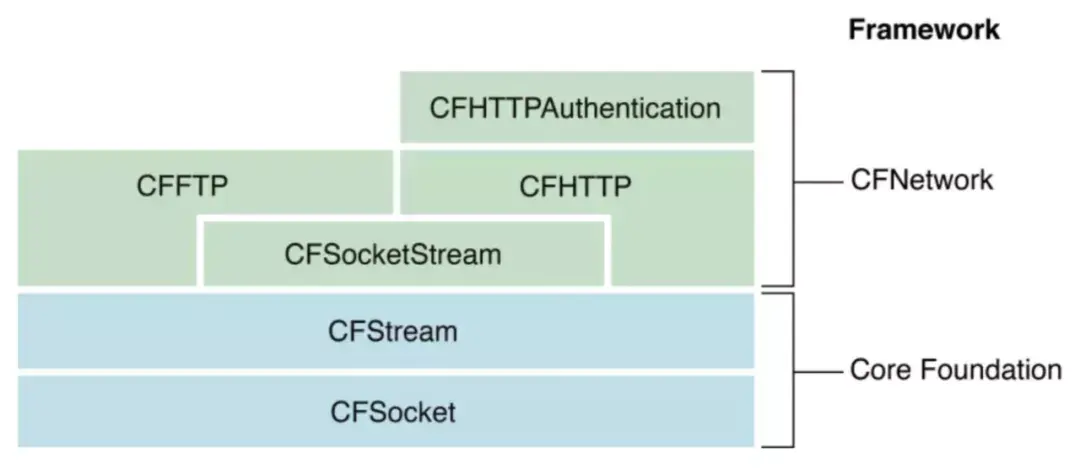- CFNetwork:iOS 网络模块核心实现层,是网络层设计中最重要的部分。负责网络协议组装发送接收等主要工作,与 CoreFoundation 框架关系紧密;