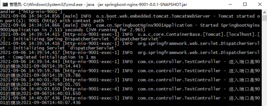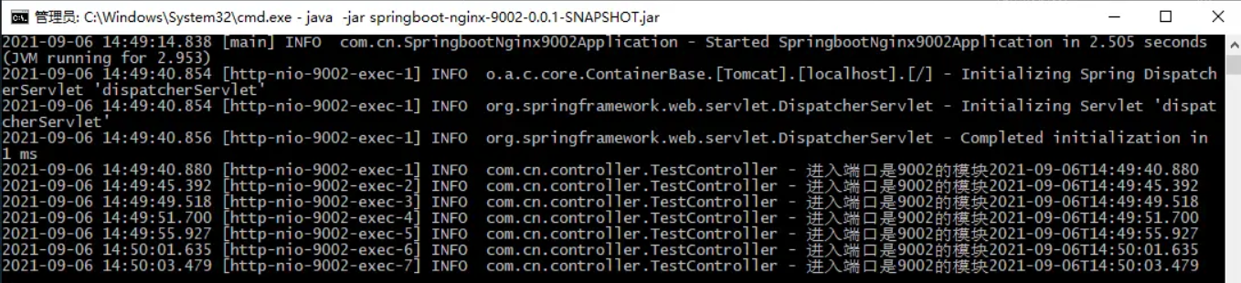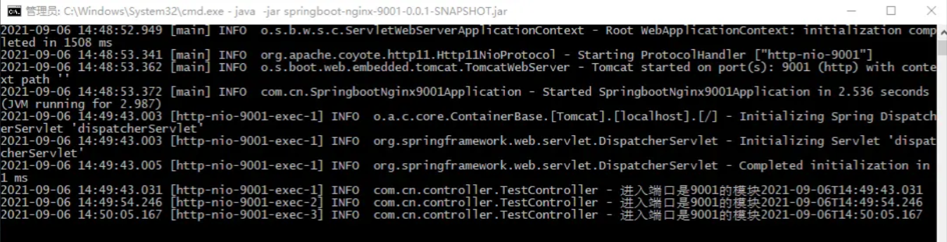 我们先将项目打成jar包,然后命令行启动项目,然后在浏览器上访问localhost来访问这两个项目,我也在项目中打印了日志,操作一下来看看结果,是不是两个项目轮询被访问。