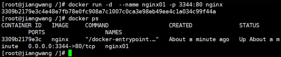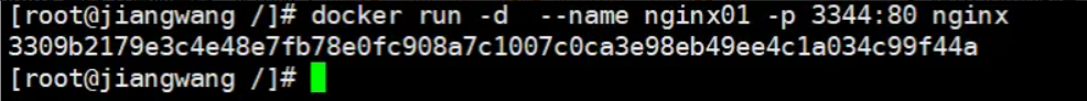2、创建 nginx 容器 并启动容器,使用命令docker run -d --name nginx01 -p 3344:80 nginx