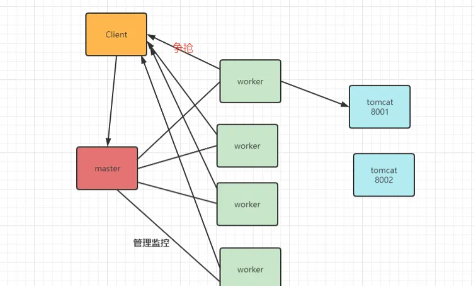 客户端发送一个请求到master后,worker获取任务的机制不是直接分配也不是轮询,而是一种争抢的机制,“抢”到任务后再执行任务,即选择目标服务器tomcat等,然后返回结果。