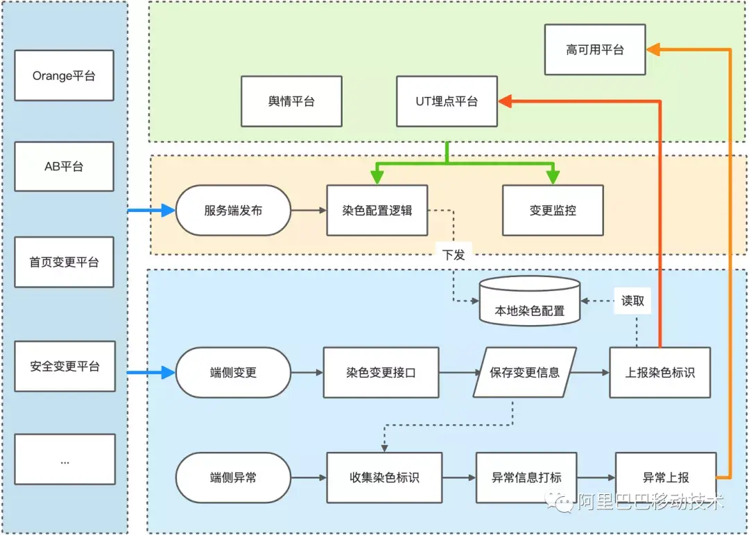 目前端侧的变更包括通用的配置变更(Orange平台)、AB试验变更和业务自定义的变更(试金石、安全、新奥创等等)。染色SDK在端侧和这些SDK进行对接,收集到端侧的变更数据后会生成对应的染色标识并上报。配合TLOG和诊断SDK,记录这些变更,并且在发生异常时给异常信息打标。平台侧也会和各个发布平台、高可用数据平台打通,根据客户端上报的数据进行发布决策。