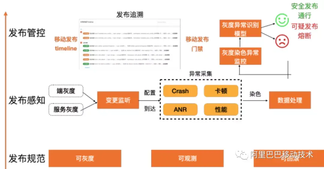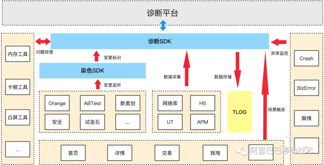 手淘中大部分的问题是因为线上变更导致的。现有监控排查体系并没有专门对变更进行监控,主要还是依赖异常数量、异常趋势进行告警。这就有一定的滞后性,导致很难在放量阶段快速的发现问题。同时对于变更发布也没有一个统一的管控标准。所以我们在端侧引入了染色SDK来收集变更数据,配合无线运维的变更诊断平台,对变更发布进行监控,做到可灰度、可观测、可回滚。