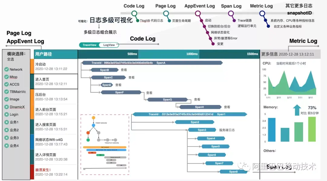 - SpanLog: 全链路日志数据。把各个独立的点串联起来,定义统一的性能度量、异常检测的标准。基于OpenTrace的方案和服务端打通,形成端到端的全链路排查机制。