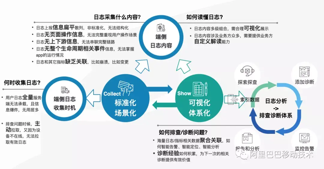 目前分析运行日志还是端侧排查问题的主要手段,前面也提到我们的日志本身存在一些问题。所以我们第一步是对日志体系进行了升级。(在此之前我们完善了日志自身的基础能力,比如提升写入性能、提升日志压缩率、提升上传成功率、建立日志的数据大盘等等)