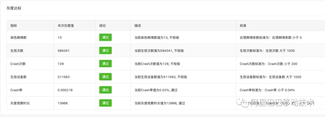 端侧上报了生效数、异常染色等数据之后,服务端就可以根据这些数据来监控变更。根据相关Crash数量、舆情数量、灰度时间等来判定当前变更是否达到了全量发布的标准。