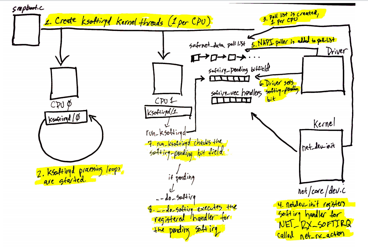 说完了整个网卡驱动部分,接下来是讲解内核子系统部分,这块会分为软中断与网络子系统初始化两部分来分享。
