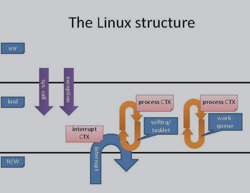 言归正传,内核延时任务有多种机制,而软中断只是其中一种。上图是 linux 的基本结构,上层是用户态,中间是内核,下层是硬件,很抽象的一个分层。用户态和内核态之间会有两种交互的方式:通过系统调用,或者通过异常可以陷入到内核态里面。那底层的硬件跟内核又是怎么交互的呢?答案是中断,硬件跟内核交互的时候必须通过中断,处理任何事件都需要产生一个中断信号来告知 CPU 与内核。