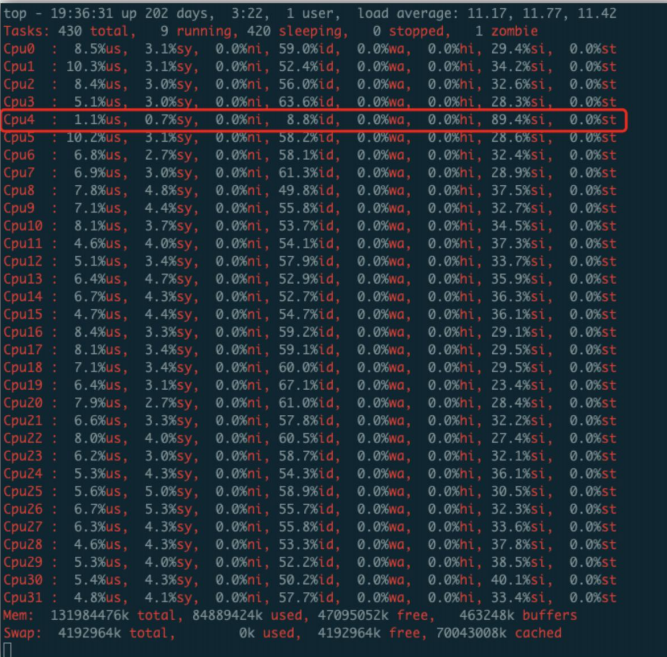 下图是业务中遇到相关问题的案例,最后排查到 CPU 层面。图一是 TOP 命令的输出,显示了每个 CPU 的使用量,其中红框标出的 CPU4 的使用率存在着异常,尤其是倒数第二列的 SI 占用达到了 89%。SI 是 softirq 的缩写,表示 CPU 花在软中断处理上的时间占比,而图中 CPU4 在时间占比上明显过高。图二则是对应图一的输出结果,CPU4 对应的是第五行,其中第三列数值明显高于其他 CPU,表明它在处理网络数据的时被频繁的打断。