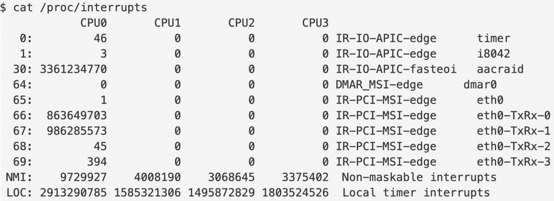 说完了运作机制,再来看看有哪些地方可以做监控。在 proc 下面有很多东西,可以看到中断的处理情况。第一列就是中断号,每个设备都有独立的中断号,这是写死的。对网络来说只需要关注网卡对应的中断号,图中是 65、66、67、68 等。当然看实际的数字并没有意义,而是需要看它的分布情况,中断是不是被不同 CPU 在处理,如果所有的中断都是被一个 CPU 处理,那么就需要做些调整,把它分散开。